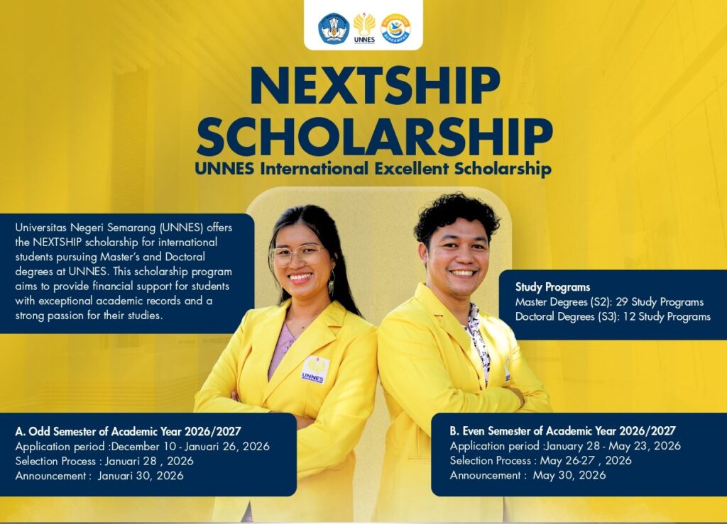Universitas Negeri Semarang (UNNES) offers the NEXTSHIP scholarship for international students pursuing Master’s and Doctoral degrees at UNNES. This scholarship program aims to provide financial support for students with exceptional academic records and a strong passion for their studies.