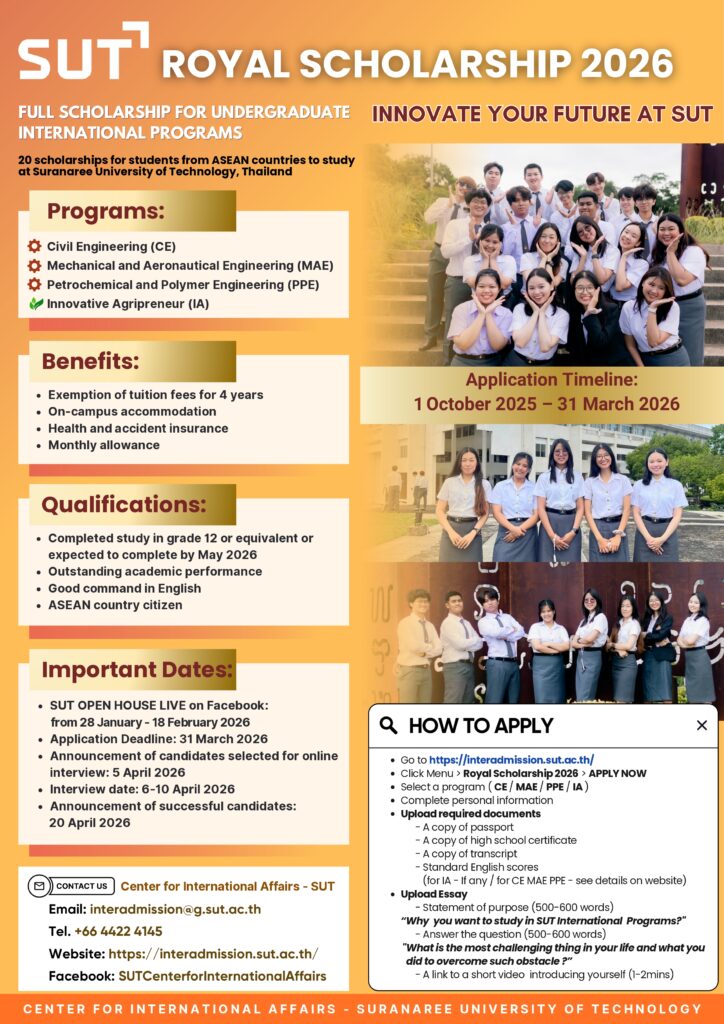 Suranaree University of Technology (SUT), Thailand is now calling for applications for The Royal Scholarship 2026 for ASEAN countries students to study in SUT international undergraduate programs, 5 scholarships for each program, giving a total of 20 scholarships.